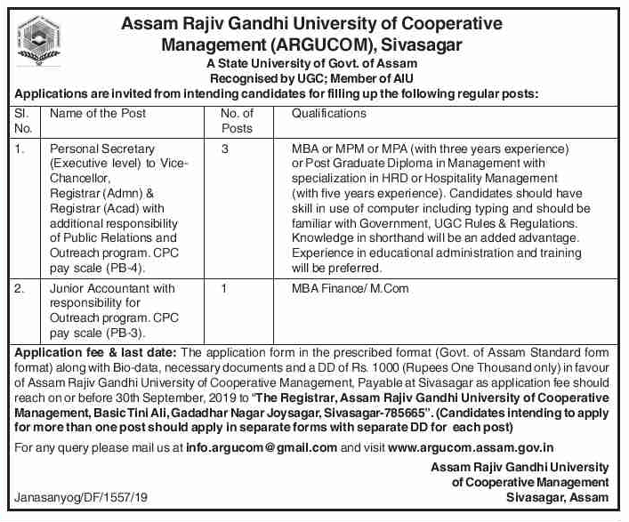 How to apply: The application form in the prescribed format (Govt. of Assam Standard form format) along with Bio-data, necessary documents and a DD of As 1000 (Rupees One Thousand only) in favour of Assam Rajiv Gandhi University of Cooperative Management Payable at Sivasagar as application fee should reach on or before 30th September, 2019 to 'The Registrar, Assam Rajiv Gandhi University of Cooperative Management, Basic Tini Ali, Gadadhar Nagar, Joysagar, Sivasagar-785665".